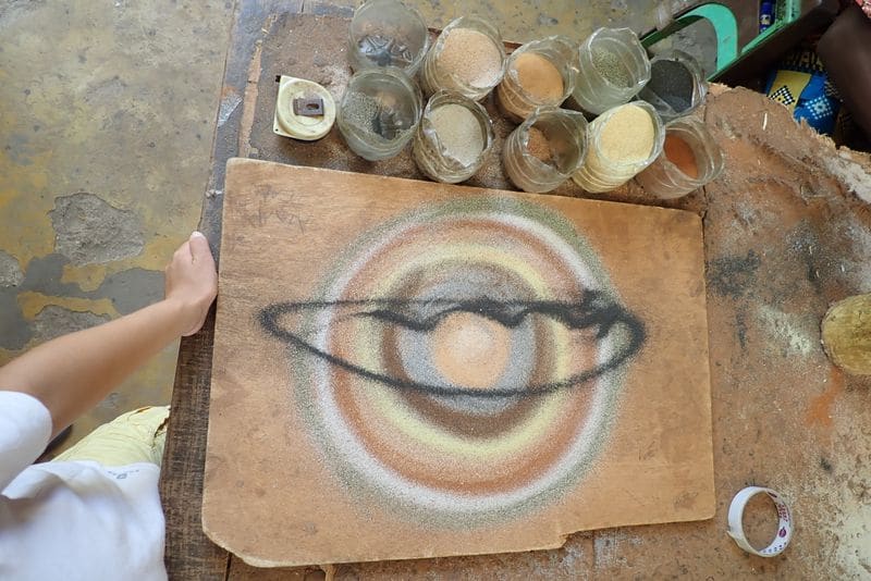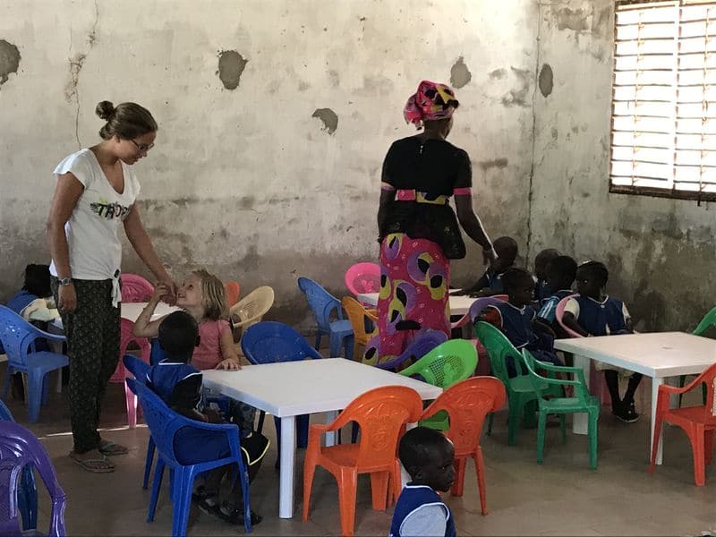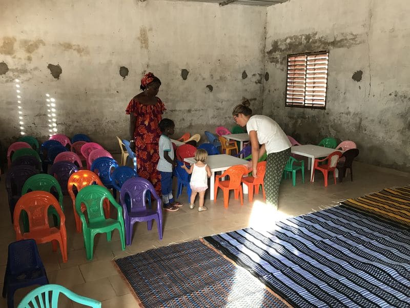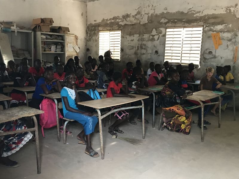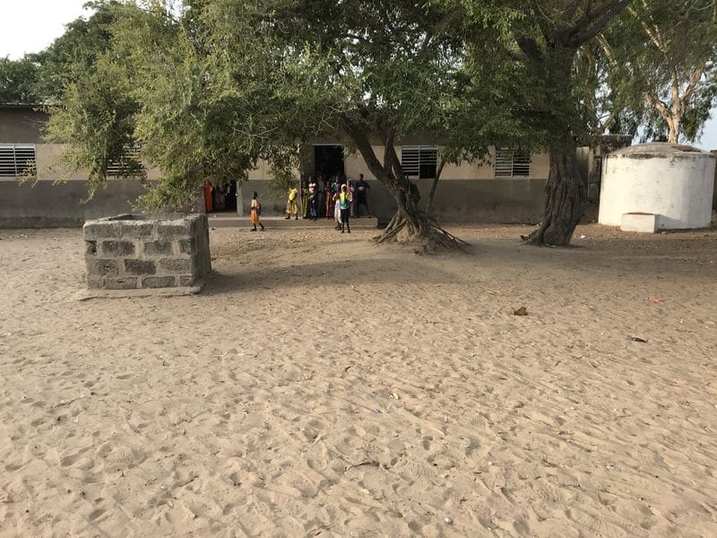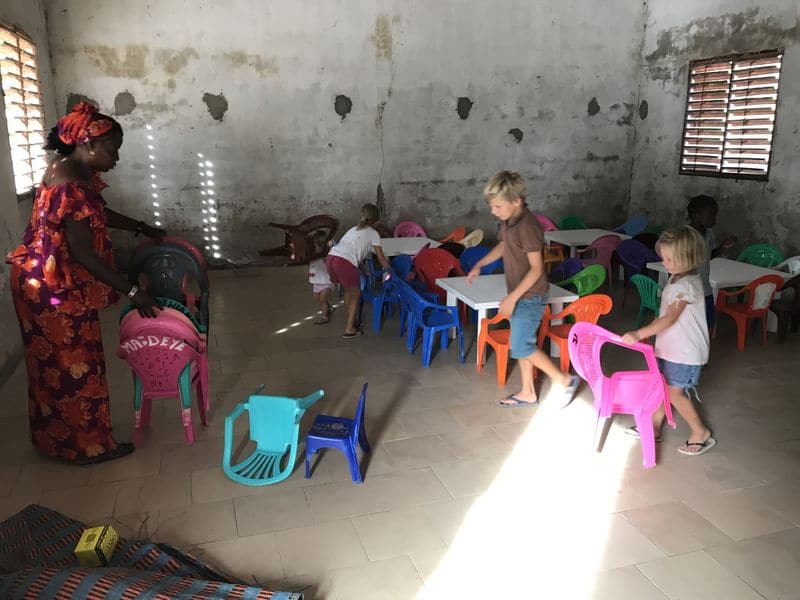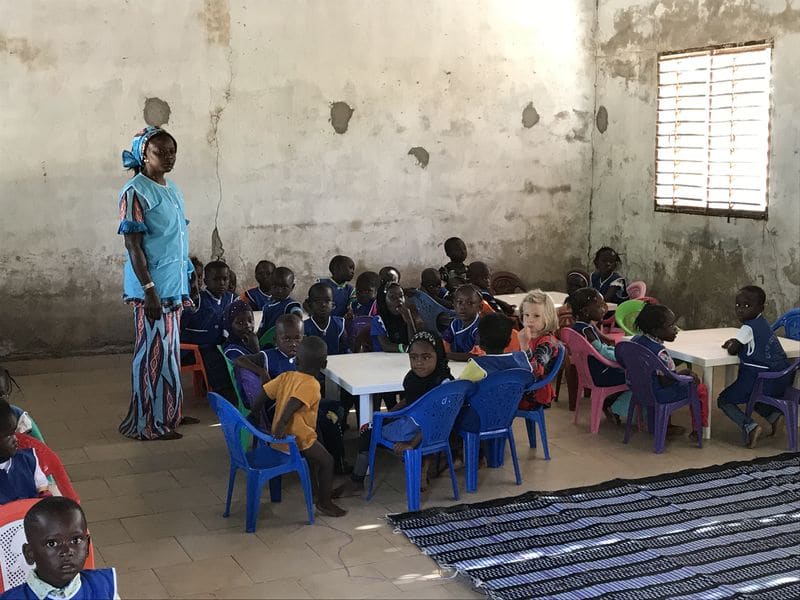 Lissa m’explique qu’elle a une classe de 64 enfants de 3 à 5 ans au sein de l’école de Thiallane. Cela fait 3 ans qu’elle travaille avec eux avec seulement 2 nattes, un tableau noir et quelques chaises apportées par les familles.