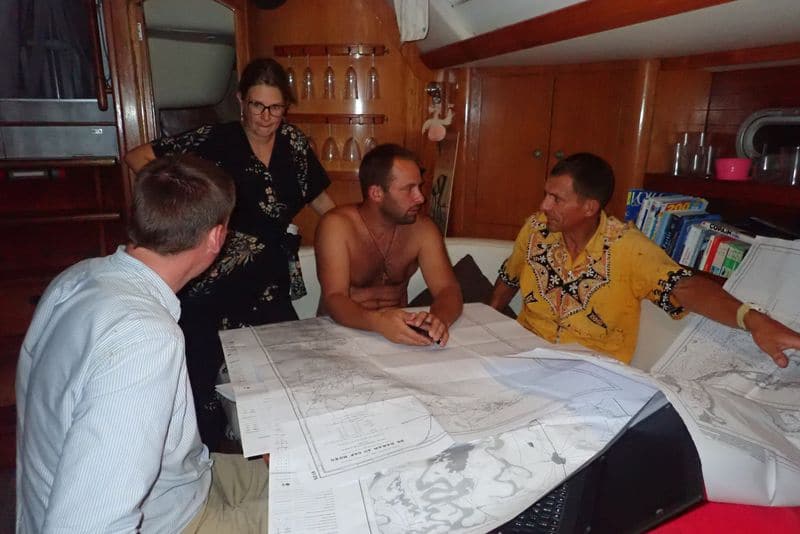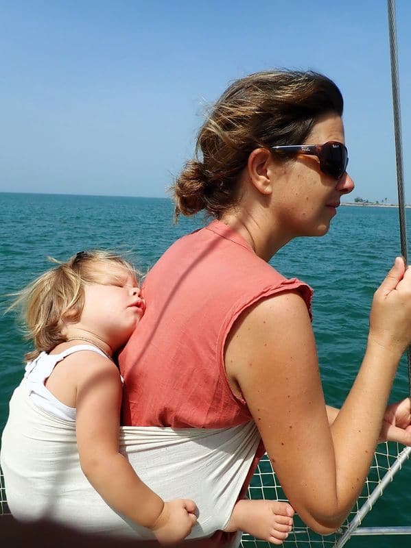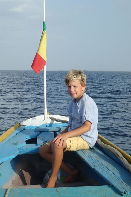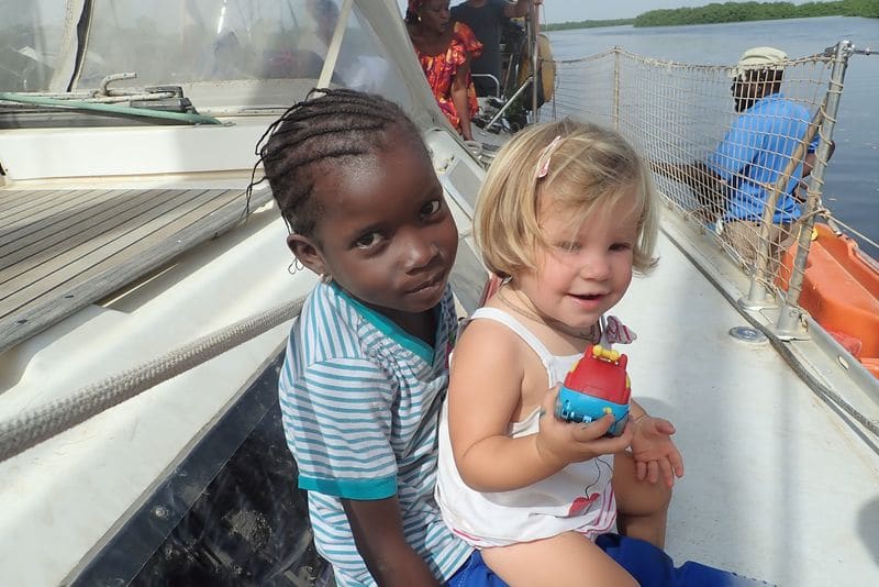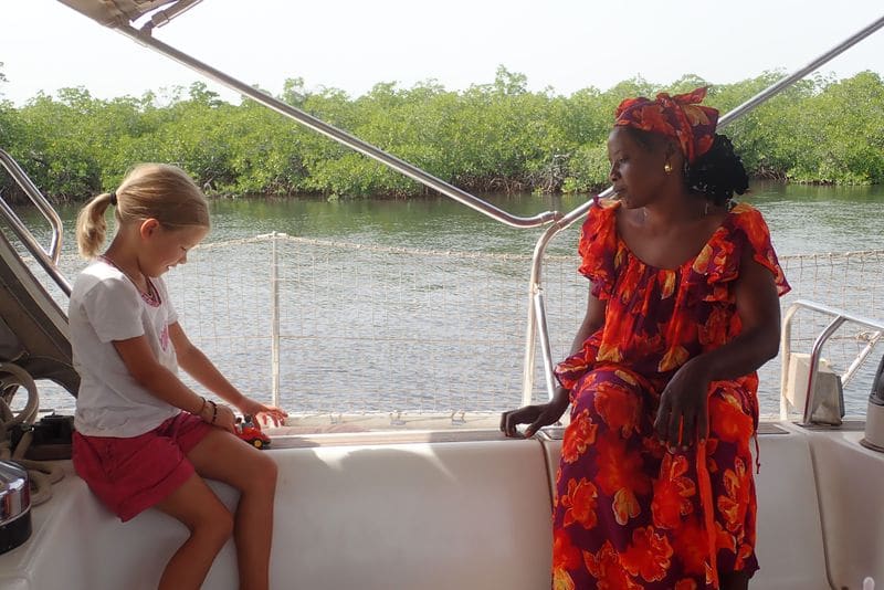 Nous rentrons donc au CVD (Centre de Voile de Dakar) et convenons que Lissa nous rejoindra le soir avec sa fille, Maïmouna, âgée de 6 ans pour embarquer ensemble pour le Saloum. Après une navigation de nuit au moteur, nous arrivons en milieu de matinée à la passe de Djeffer, juste à temps pour la marée. Nous passons le chenal sans problème et retrouvons Seydou du côté de Djinda. Sa présence est bien utile puisque malgré la marée favorable, notre sondeur nous alerte une ou deux fois. Nos deux mètres de tirant d’eau passent parfois à seulement 30cm du fond, mais ça passe !