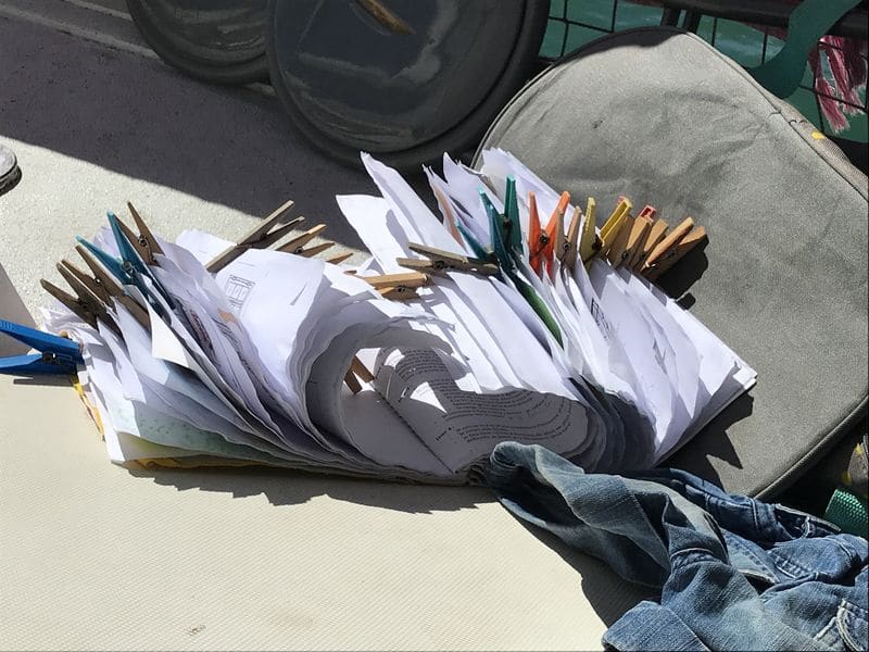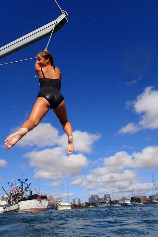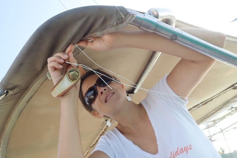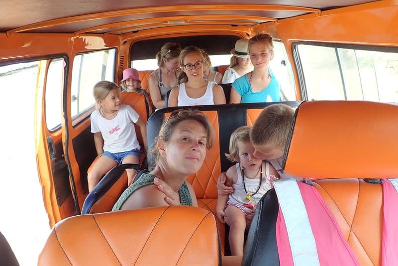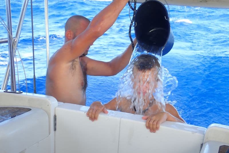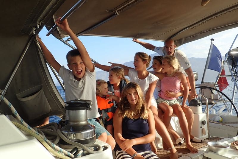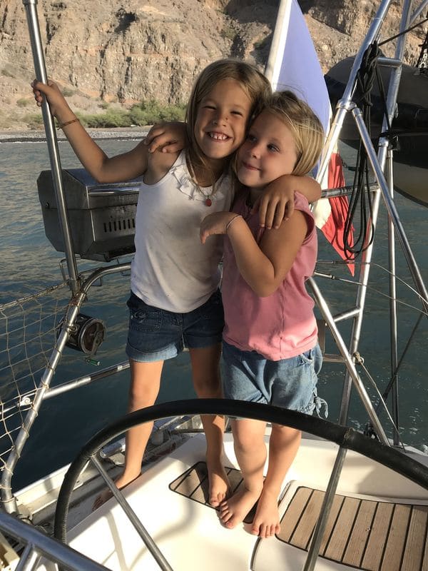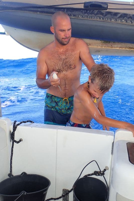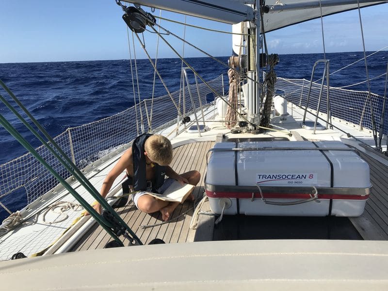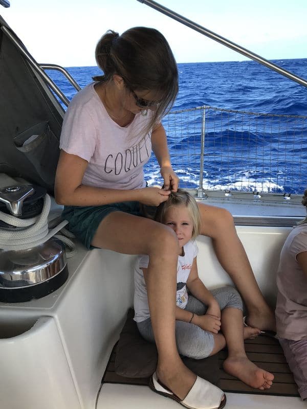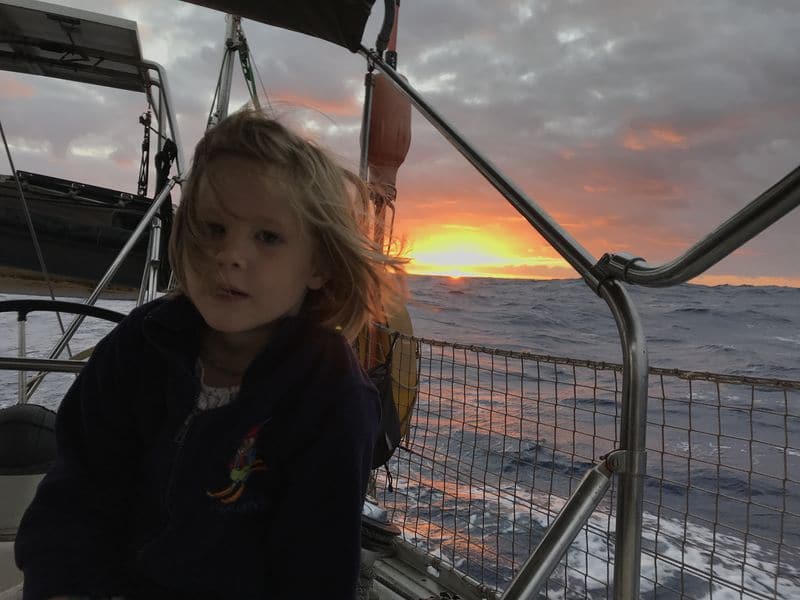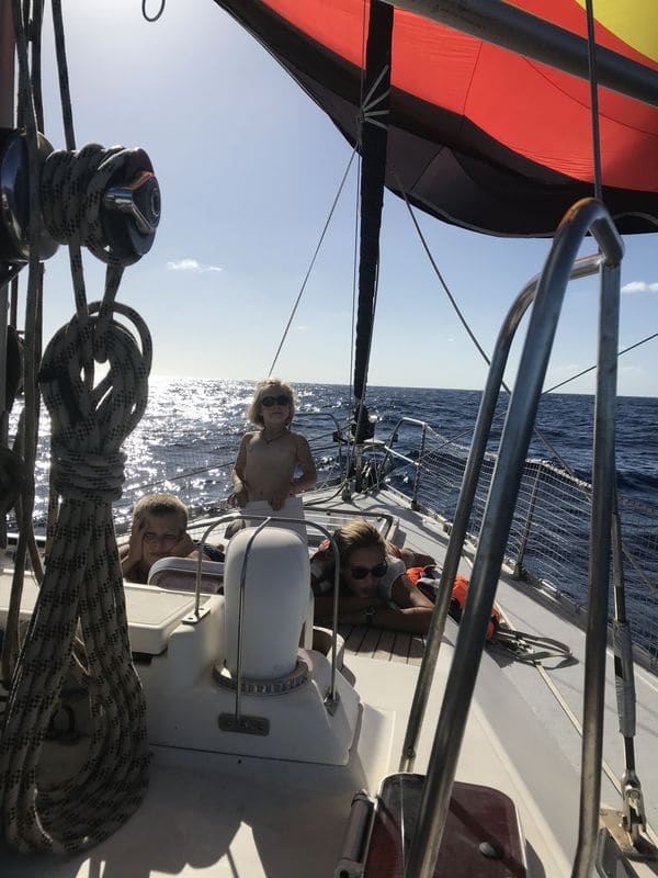 Avant d’arriver au rythme de croisière, nous essuyons quelques jours de grosse tension nerveuse à la tombée du jour. A partir de 17h c’est le branlebas pour préparer la nuit. Toilette, diner, rangement du bateau. La pression monte dangereusement avec le soleil qui se couche. Il y a pas mal de choses à faire avant la nuit, vaisselle, brossage des dents, les petits à coucher etc…et peu de place pour accomplir chacun notre devoir sans nous gêner. Du coup, le ton monte, les plus sensibles et nerveux s’échauffent, crient ou hurlent, insultent tout le monte, claquent les portes…un vrai bonheur ! Le schéma se reproduit chaque soir, jusqu’à ce que nous instaurions l’histoire audio pour les 4 plus jeunes. C’est quasi magique, tout le monde se calme avant d’aller se coucher. Nous parvenons même à avoir un petit temps privilégié dans le cockpit, Olivia et moi, avant le premier quart.