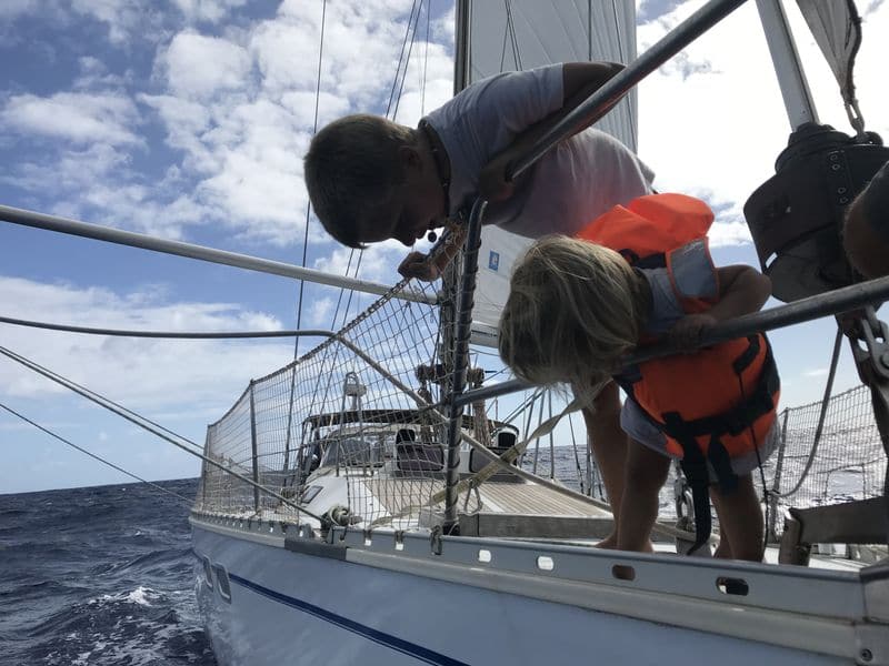 Notre tansat commence à Mindelo par une minutieuse préparation de SEA YOU. Tout l’équipage met la main à la patte. Contrôle des parties immergées, du secteur de barre, du pilote automatique, des pompes de fond de cale, du gréement, des voiles. Chaque poulie, mousqueton, manille, est contrôlé, graissé, sécurisé. Olivia s’occupe activement à remplir les soutes de conserves, de féculents en grande quantité, et d’un maximum de produits frais. Révision complète du moteur, pleins d’eau et de gasoil. Le bateau et l’équipage est fin prêt pour le départ. Jean-François et Nathalie des amis expérimentés qui sont par hasard de passage à Mindelo à ce moment-là nous prodiguent conseils et astuces aussi bien pour la préparation que pour la transat elle-même. Merci beaucoup à tout les deux, nous sommes partis grâce à vous très sereinement.