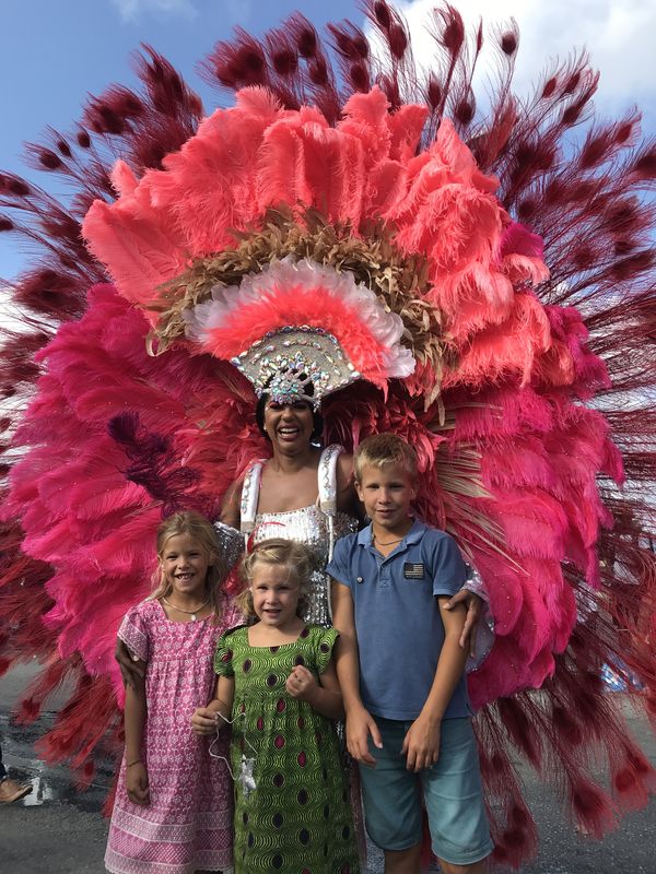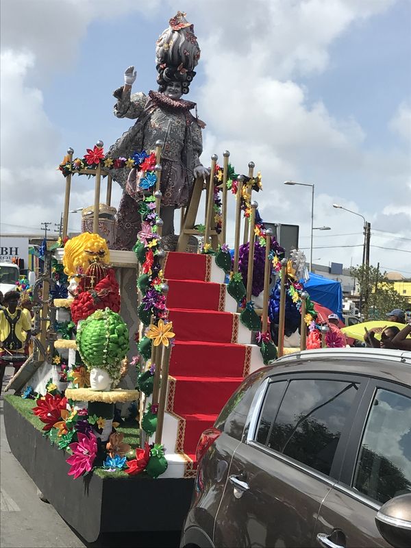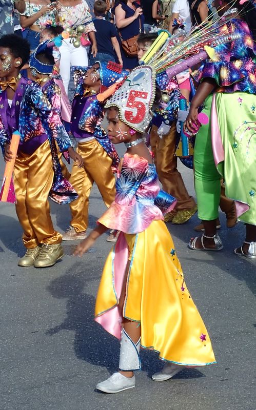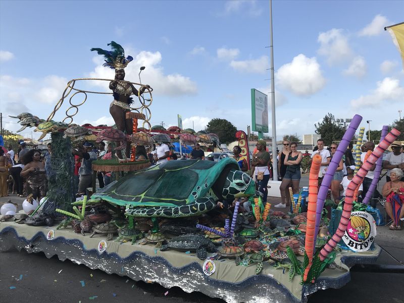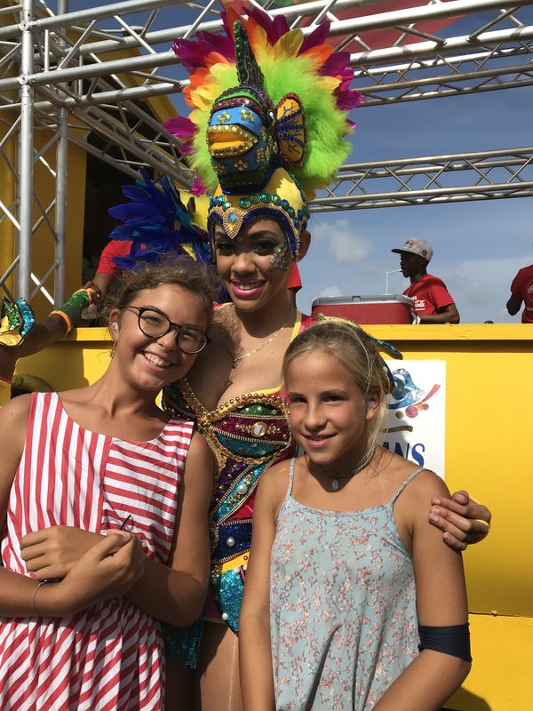 Ici aussi le carnaval bat son plein. Le dimanche après-midi nous nous postons sur le trajet de la grande parade et là nous sommes émerveillés ! C’est digne de Rio ! Des plumes, des couleurs, des chars impressionnants et des costumes extravagants, le spectacle est superbe. Nous avons cependant pris soin de protéger nos oreilles avec des boulettes de coton. Ysance peut ainsi poursuivre sa sieste sans le moindre dérangement. Il faut bien avouer que si notre vue est enchantée par ce défilé nos oreilles risquent d’en payer le prix fort ! Nous ne sommes pas habitués à cette puissance sonore qui semble vraiment réjouir les habitants de Caraïbes.
