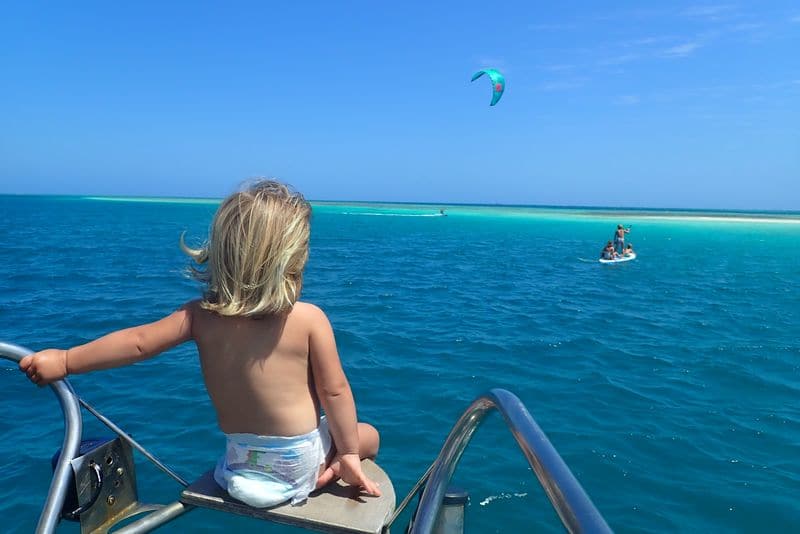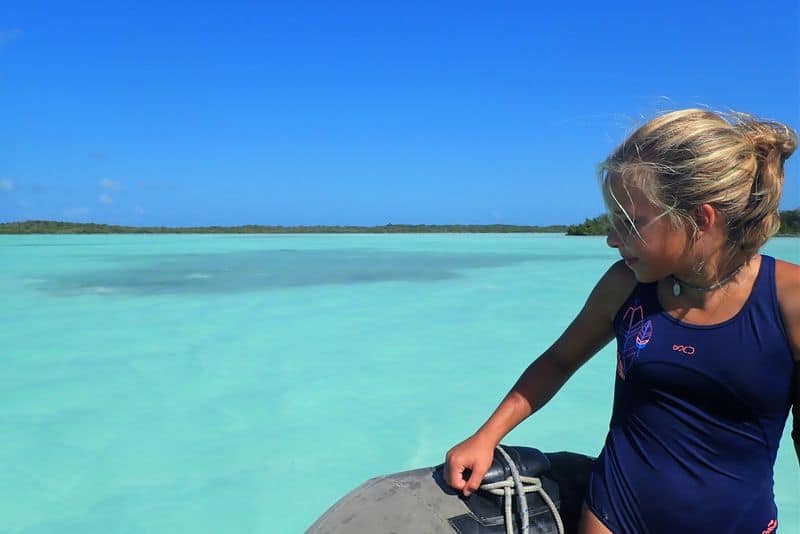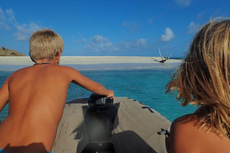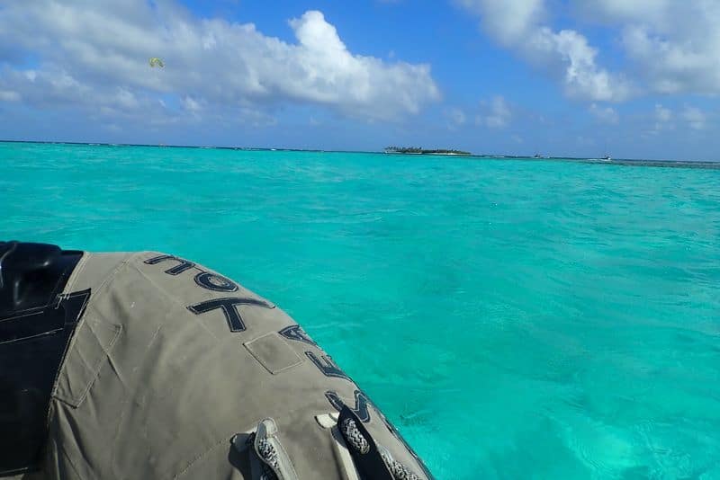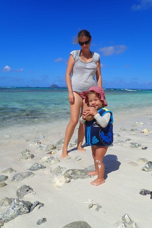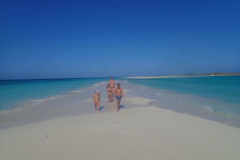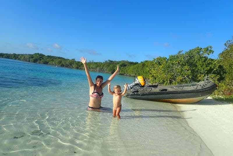 Nous partons d’abord vers le sud-est des Roques. Nous faisons une première escale devant une langue de sable près de Cayo Sardina, au milieu de nulle part, c’est incroyable ! C’est pour Gérault et Vincent l’occasion de poursuivre la pratique du kite surf et pour Zélie le lieu idéal pour apprendre à nager sans bouées sous le regard bienveillant de Jeanne et de maman.