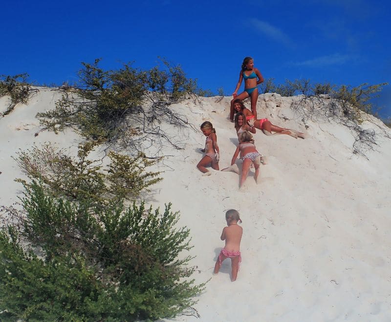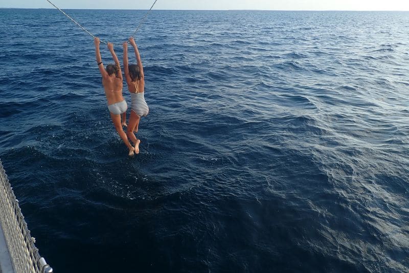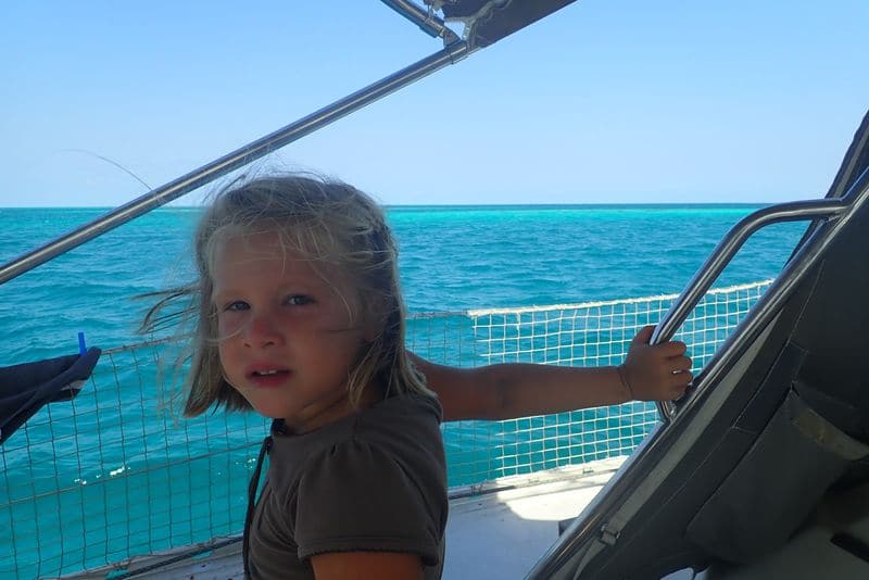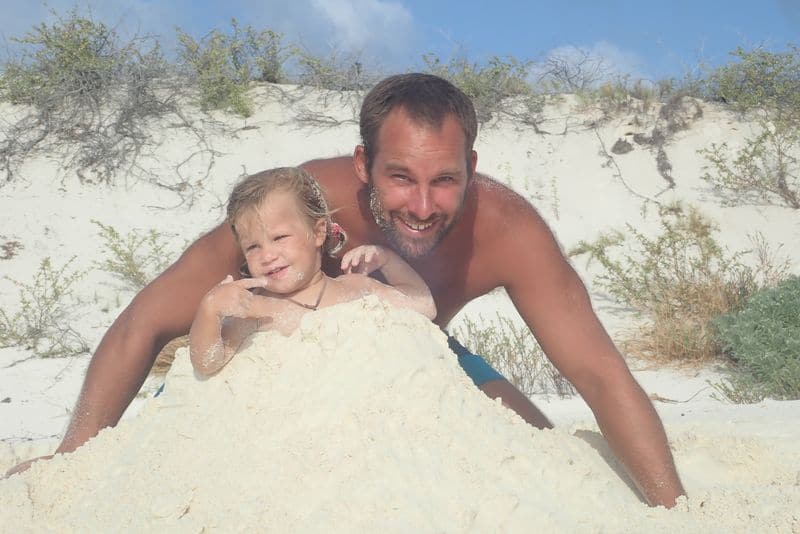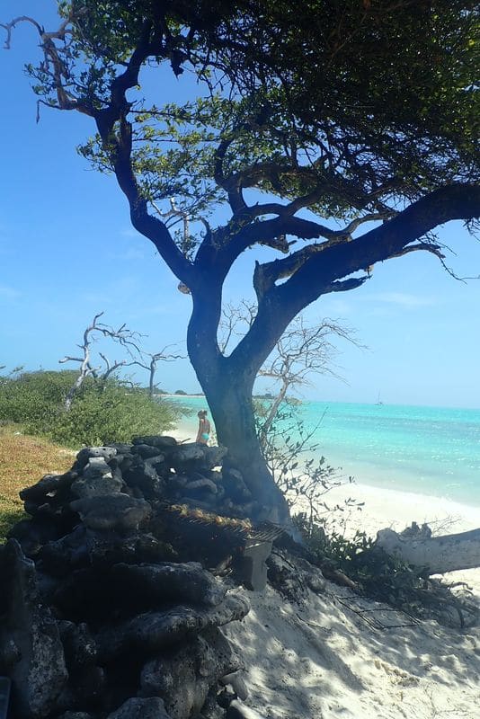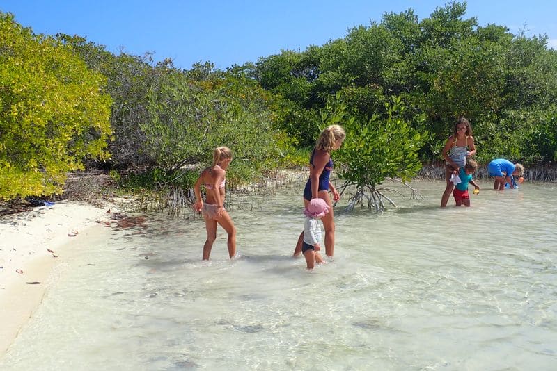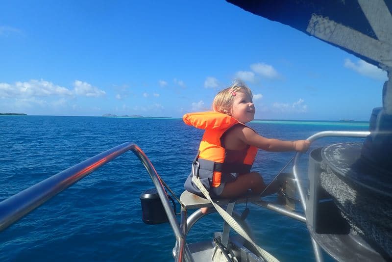 Nous partons d’abord vers le sud-est des Roques. Nous faisons une première escale devant une langue de sable près de Cayo Sardina, au milieu de nulle part, c’est incroyable ! C’est pour Gérault et Vincent l’occasion de poursuivre la pratique du kite surf et pour Zélie le lieu idéal pour apprendre à nager sans bouées sous le regard bienveillant de Jeanne et de maman.