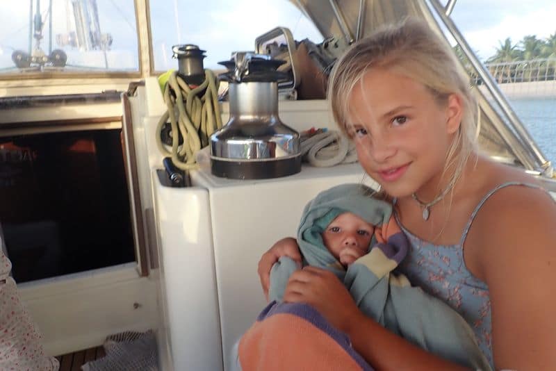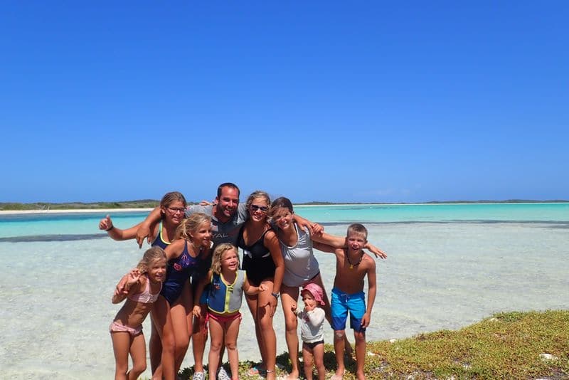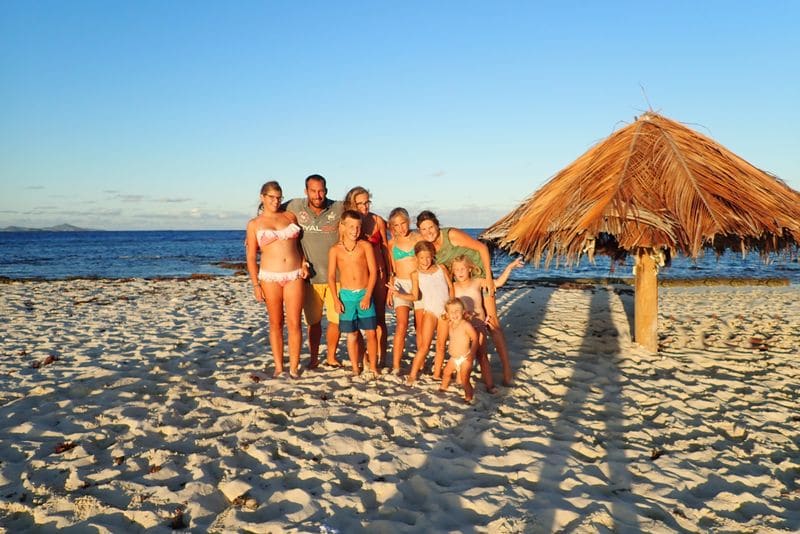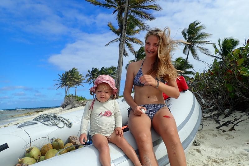 De notre mouillage, nous avons une vue dégagée sur le lagon et l’île de Petit Tabac qui apparaît elle aussi dans Pirates des Caraïbes. Nous y faisons une petite excursion en annexe. Pas facile de passer la barrière de corail au sec. Il y a pas mal de mer et nous arrivons sur l’île déserte littéralement trempés ! Les grands vont plonger et les petits s’organisent pour faire un élevage de Bernard l’hermite gros comme le poing en les emprisonnant dans un cirque de conques ! Du jamais vu sous nos latitudes !