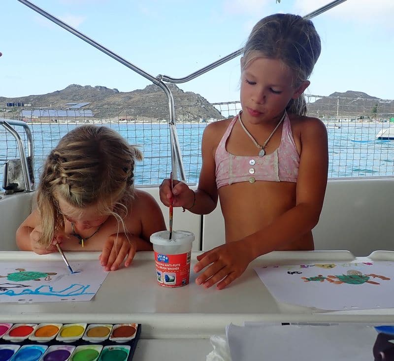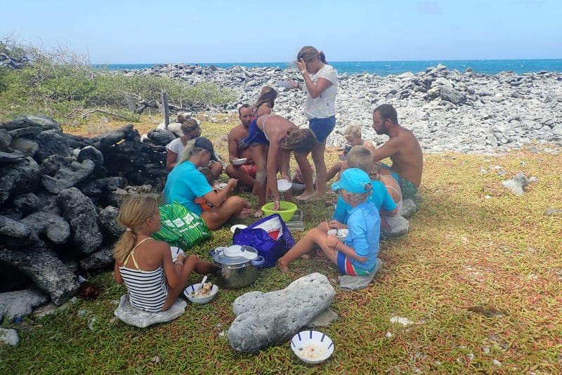 Vincent et Gérault nous préparent un superbe barbecue sur la plage avec de délicieuses brochettes poulet-ananas. Le congélateur des Comalvi offre des possibilités qui nous réjouissent : nous sommes bien heureux de pouvoir manger du poulet ! Après l’élevage de Bernard l’Hermitte aux Grenadines, les enfants fabriquent un cirque pour les lézards qu’Amicie capture avec une aisance déconcertante!