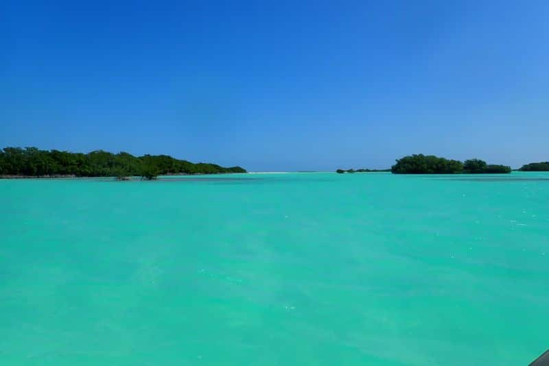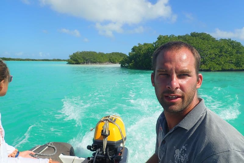 Nous partons en annexe explorer la mangrove et l’intérieur du lagon. Les nuances de verts et de bleus de l’eau sont à couper le souffle !