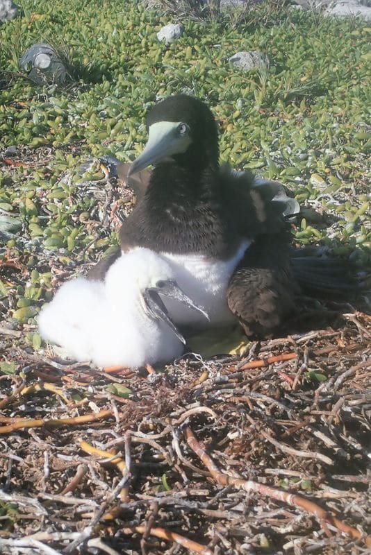 Vincent assouvit une petite part de son envie d’exploration. Il part avec Médéric visiter l’épave d’un voilier et revient avec de magnifiques images des boobies (genre de fous qui ne sont pas de bassan !) qui nichent sur la côte au vent. Les nids sont souvent garnis de 2 ou 3 œufs mais on aperçoit parfois une petite boule de duvet blanc entre leurs pattes !