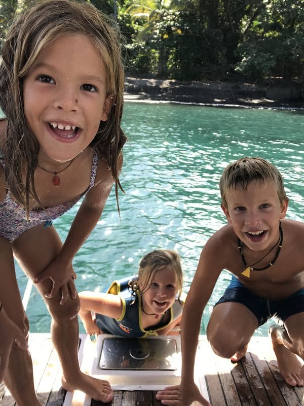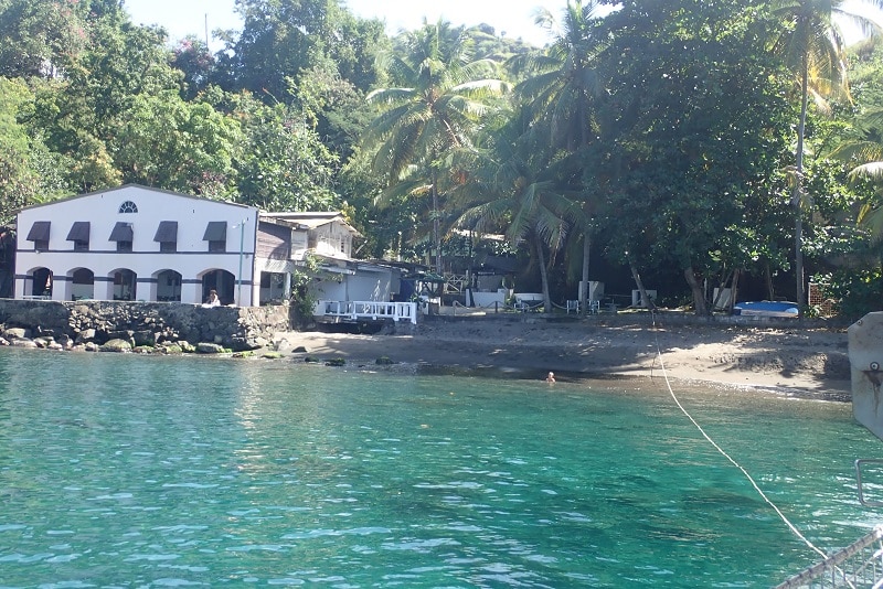 Nous repartons après seulement 48h pour continuer notre descente vers Saint Vincent. La baie dans laquelle nous nous arrêtons est Walli Labou Bay. Nous sommes sur les traces des pirates des Caraïbes, un certain nombre d’images des films ayant été tournées ici! Nous reconnaissons tout de suite le fameux rocher des pendus qui nous accueille. Dans ce décors de cinéma nous trouvons un petit havre de paix. Nous mouillons Sea You la poupe vers la plage retenu par une haussière fixée à un cocotier. Les enfants se réjouissent de pouvoir accéder à la plage à la nage. Ils y font leur pause au milieu de la matinée de travail.