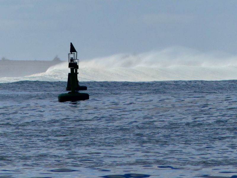 Installé près de la fenêtre sans vitre, de la chapelle, j’ai une très belle vue sur le mouillage et sur la plage où est installé notre annexe. Je garde un œil sur celle-ci et sur SEA YOU que l’on voit très bien depuis la chapelle. Les vagues grossissent au loin. On croirait voir apparaître à l’horizon de nouvelles îles volcaniques mouvantes. Ca déferle avec force sur la côte, et le mât de notre voilier se balance avec amplitude. Entrainé plus près de la côte à chaque série de gros rouleaux, il est plus ou moins repoussé au loin par le petit souffle du vent entre chaque. Tendu, je surveille la position du mat par rapport à la colline dernière. A certains moment, SEA YOU est à peine à quelques mètres de la zone où les rouleaux explosent. L’angoisse me serre la gorge et me retourne l’estomac. Je lutte contre les scénarios catastrophes qui se forment dans mon esprit. Je vois déjà notre voilier poussé à la côte par les vagues, se faire drosser et rapidement se délaminer. Au milieu de la messe, tous les bateaux qui sont mouillés autour de SEA YOU sont déplacés.