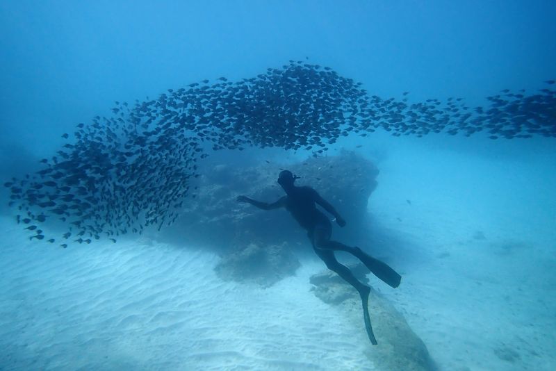 Ces nuées d’oiseaux donnent même quelques sueurs froides à Vincent. Parti nager  avec masque et palmes, il s’aperçoit soudain que plusieurs centaines d’oiseaux planent en rond au-dessus de sa tête. L’auraient-ils pris pour un très gros poisson ? Il voit alors plusieurs frégates plonger à tour de rôle en piqué sur lui puis remonter au dernier moment. Il agite les bras pour que la confusion ne soit plus permise et se dépêche de remonter à bord de Sea You. Petite réminiscence du film « Les oiseaux » d’Alfred Hitchcock !😁😁😁