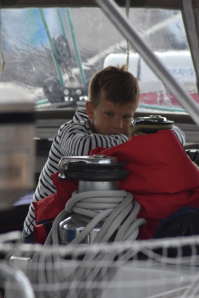 En fin de matinée nous essuyons notre premier grain. Le ciel s’obscurci. Nous réduisons la toile et nous nous équipons. Les plus jeunes ne sont pas très rassurés. Mais l’inquiétude est de courte durée. Le comportement de Sea You est exemplaire.