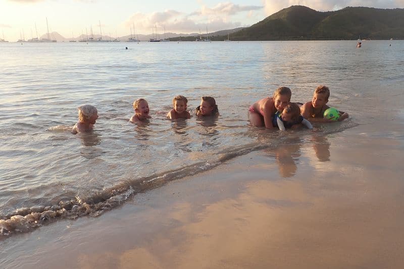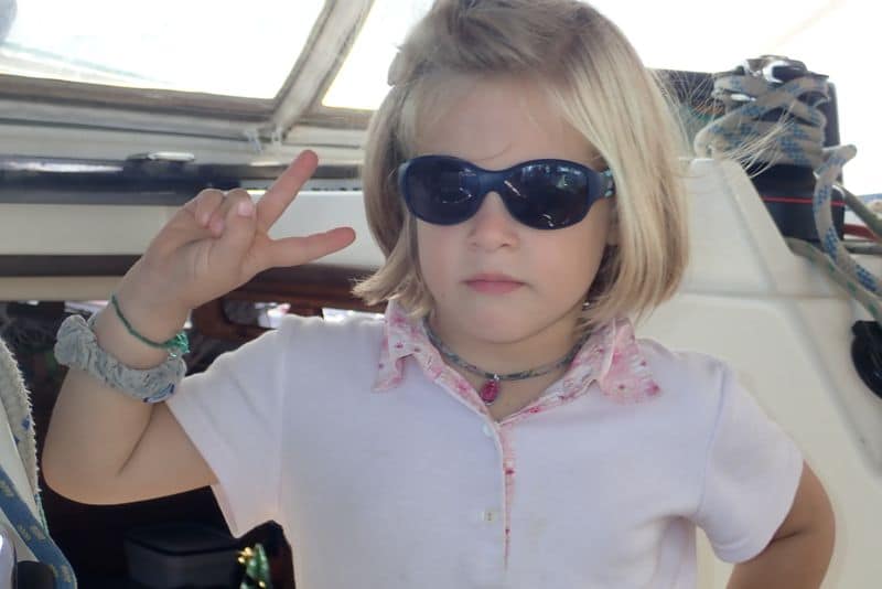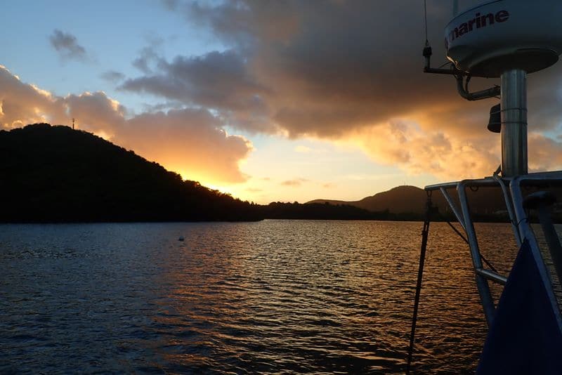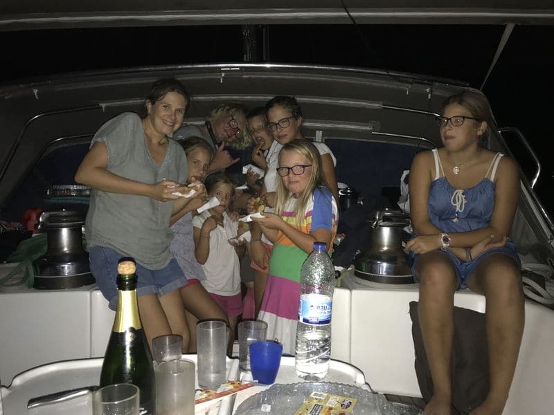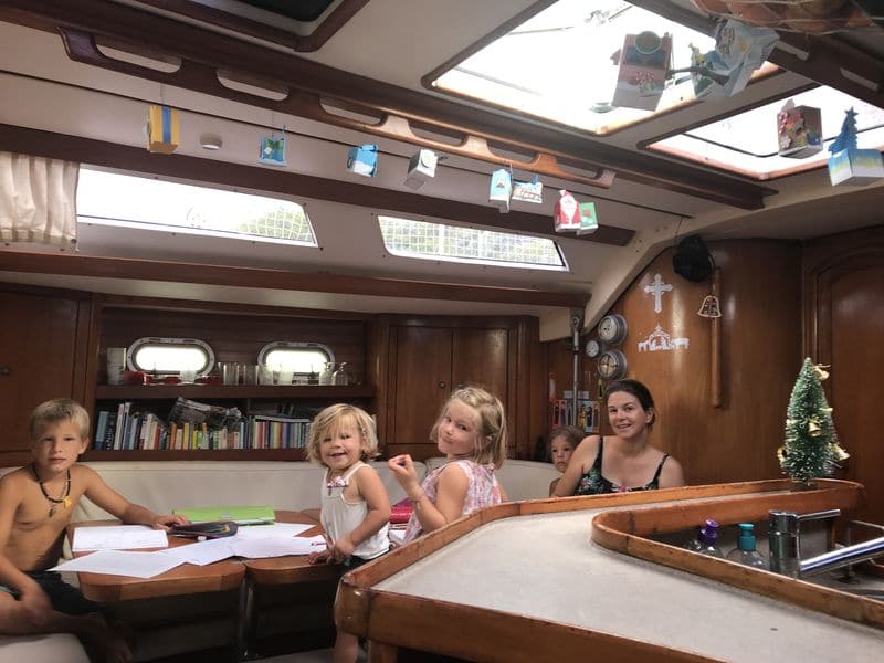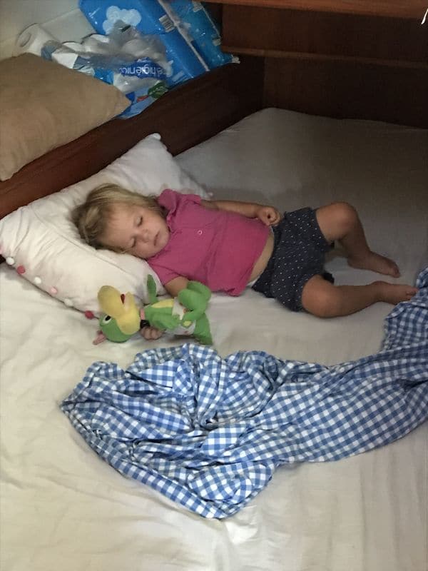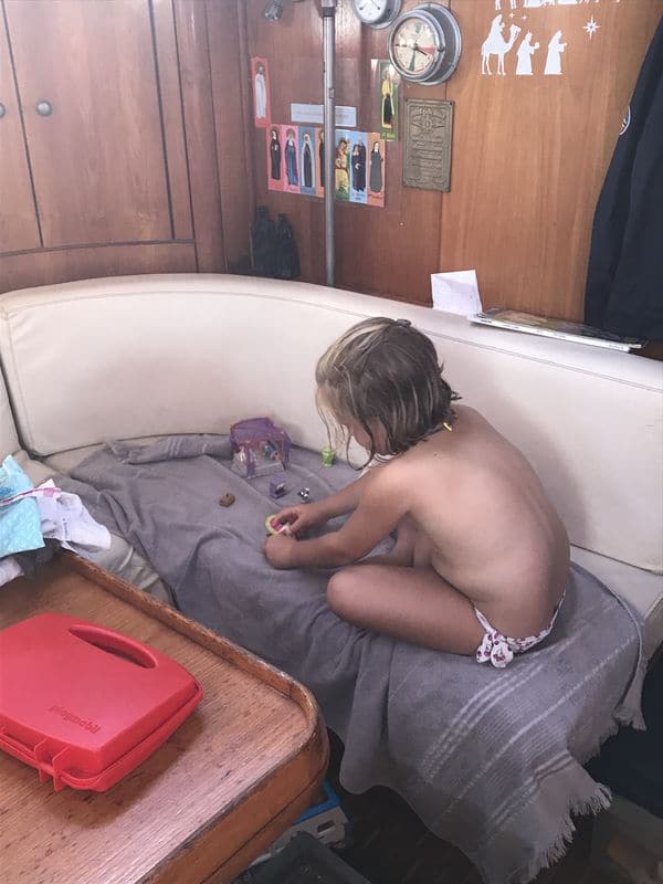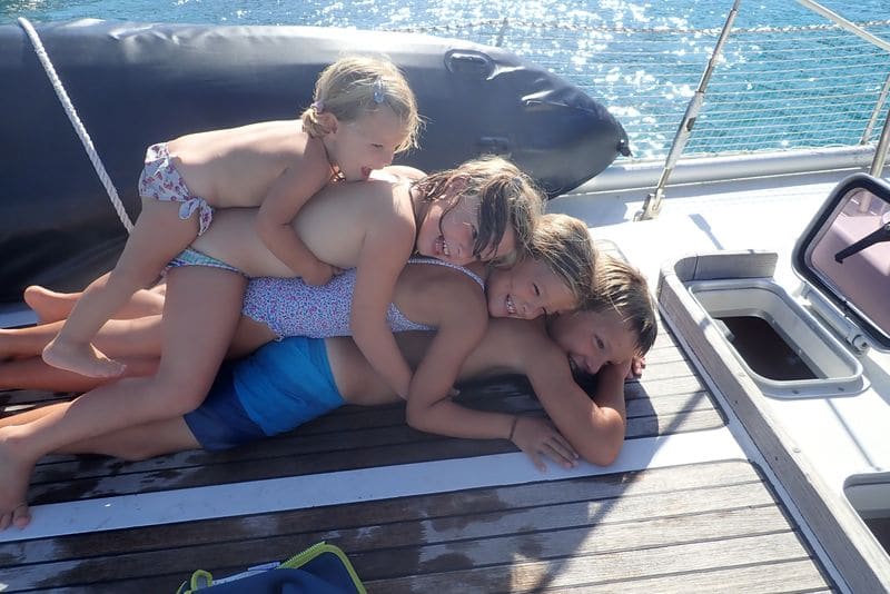 Avant d’arriver au rythme de croisière, nous essuyons quelques jours de grosse tension nerveuse à la tombée du jour. A partir de 17h c’est le branlebas pour préparer la nuit. Toilette, diner, rangement du bateau. La pression monte dangereusement avec le soleil qui se couche. Il y a pas mal de choses à faire avant la nuit, vaisselle, brossage des dents, les petits à coucher etc…et peu de place pour accomplir chacun notre devoir sans nous gêner. Du coup, le ton monte, les plus sensibles et nerveux s’échauffent, crient ou hurlent, insultent tout le monte, claquent les portes…un vrai bonheur ! Le schéma se reproduit chaque soir, jusqu’à ce que nous instaurions l’histoire audio pour les 4 plus jeunes. C’est quasi magique, tout le monde se calme avant d’aller se coucher. Nous parvenons même à avoir un petit temps privilégié dans le cockpit, Olivia et moi, avant le premier quart.