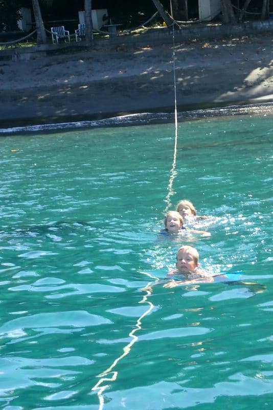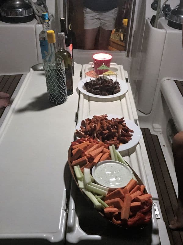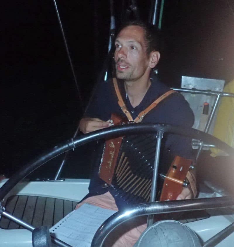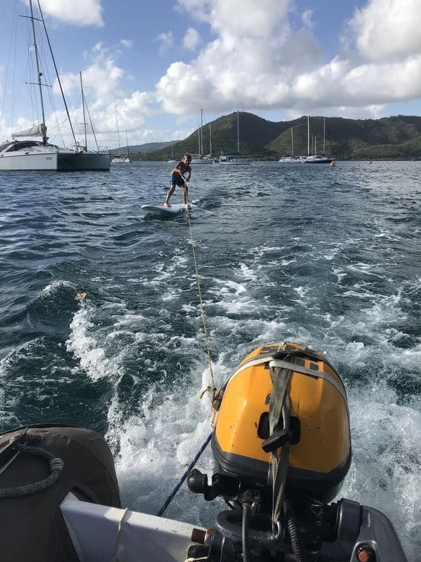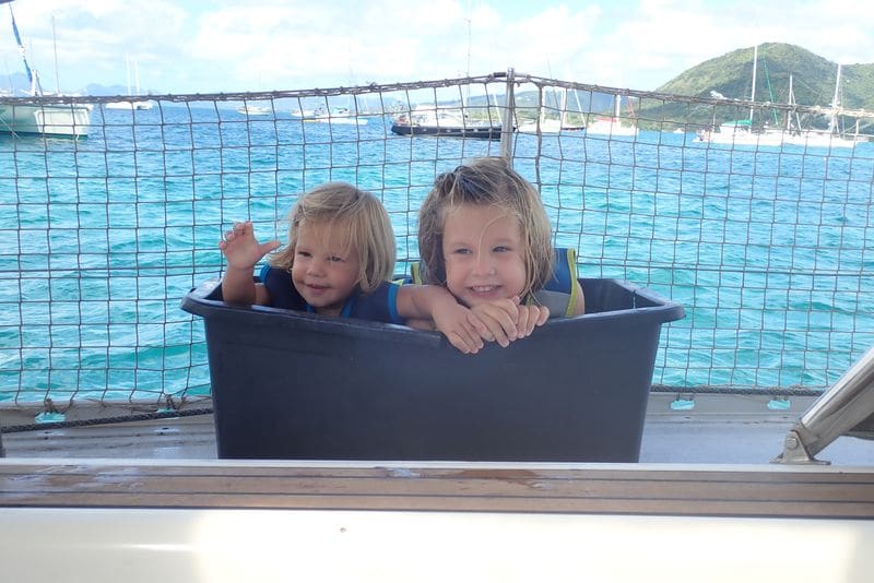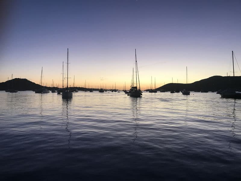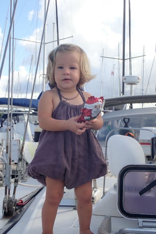 Avant d’arriver au rythme de croisière, nous essuyons quelques jours de grosse tension nerveuse à la tombée du jour. A partir de 17h c’est le branlebas pour préparer la nuit. Toilette, diner, rangement du bateau. La pression monte dangereusement avec le soleil qui se couche. Il y a pas mal de choses à faire avant la nuit, vaisselle, brossage des dents, les petits à coucher etc…et peu de place pour accomplir chacun notre devoir sans nous gêner. Du coup, le ton monte, les plus sensibles et nerveux s’échauffent, crient ou hurlent, insultent tout le monte, claquent les portes…un vrai bonheur ! Le schéma se reproduit chaque soir, jusqu’à ce que nous instaurions l’histoire audio pour les 4 plus jeunes. C’est quasi magique, tout le monde se calme avant d’aller se coucher. Nous parvenons même à avoir un petit temps privilégié dans le cockpit, Olivia et moi, avant le premier quart.